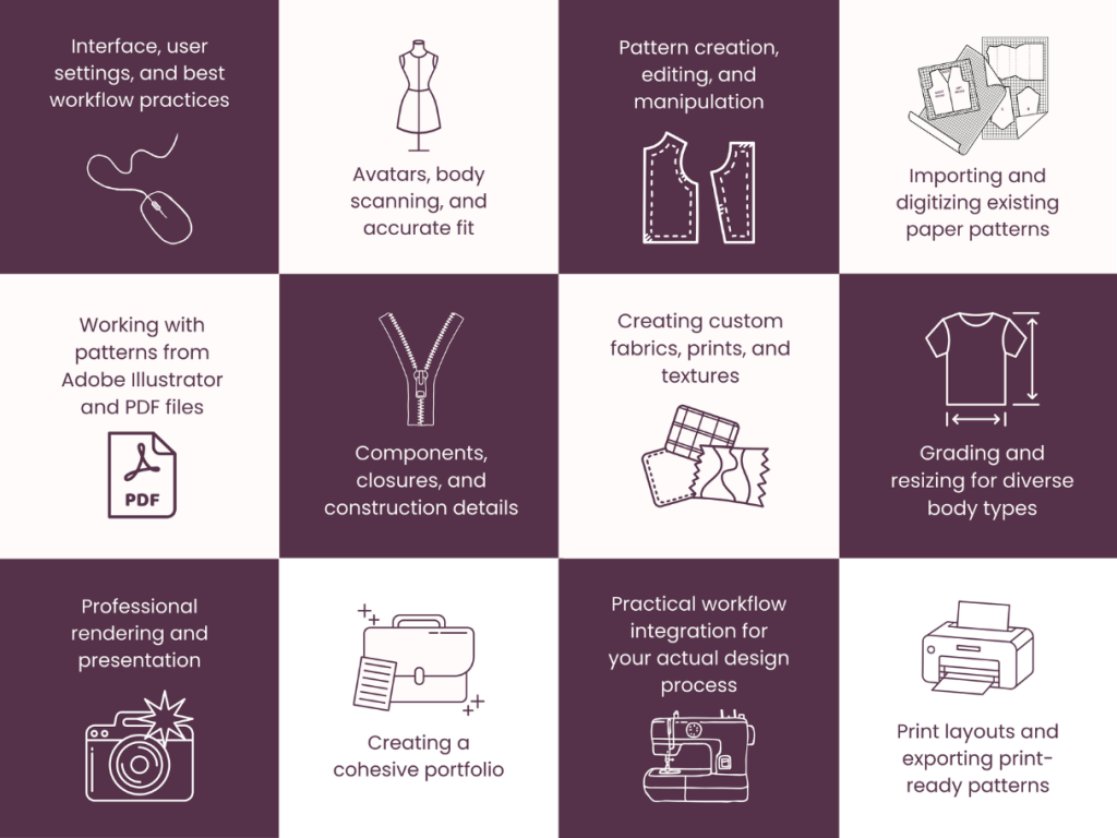 ✨ You’ll learn CLO3D through a size-inclusive, custom-fit lens that emphasizes practical, real-world applications: